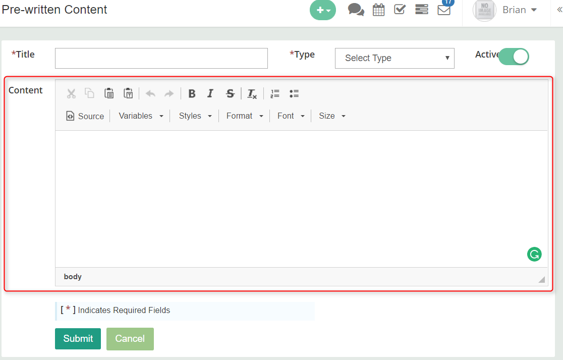 Once complete, click Submit to complete the entry. The new Pre-written Content has been added and can now be used.