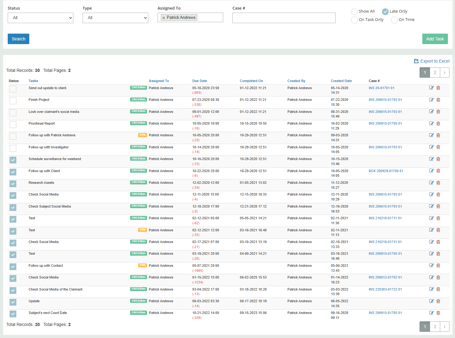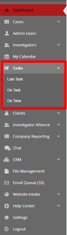 3. Users can also manage all tasks from Cases and the CRM by clicking on "Tasks" from the lefthand navigation bar and selecting one of the three options.