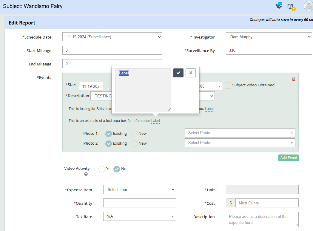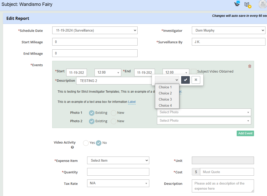 If you have specific templates you would like investigators to follow when writing report entries, you can adjust your settings so that Investigators only have to choose from a drop-down menu of pre-determined options to complete report entries. These pre-determined options can be customized to your business needs, allowing you to have uniform reports from your investigators when it comes to how reports are written.