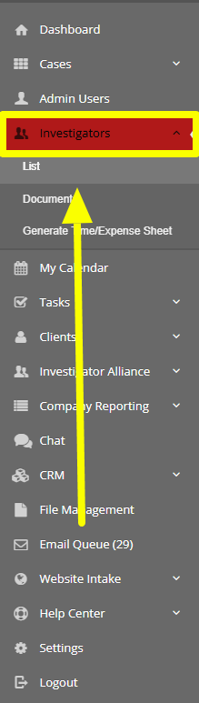 1. Click on "Investigators" from the left hand navigation bar and then select list from the drop down.