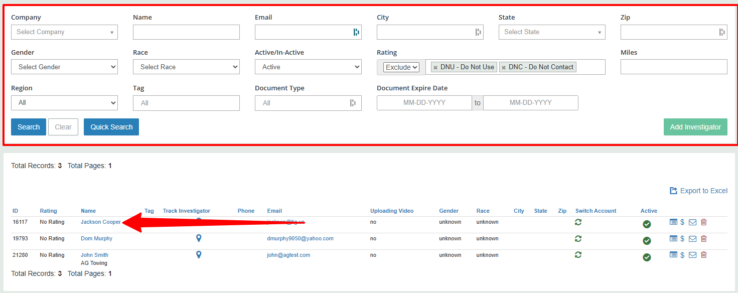 2. Use the parameters to locate the investigator profile you want to make inactive and then clock on their name.