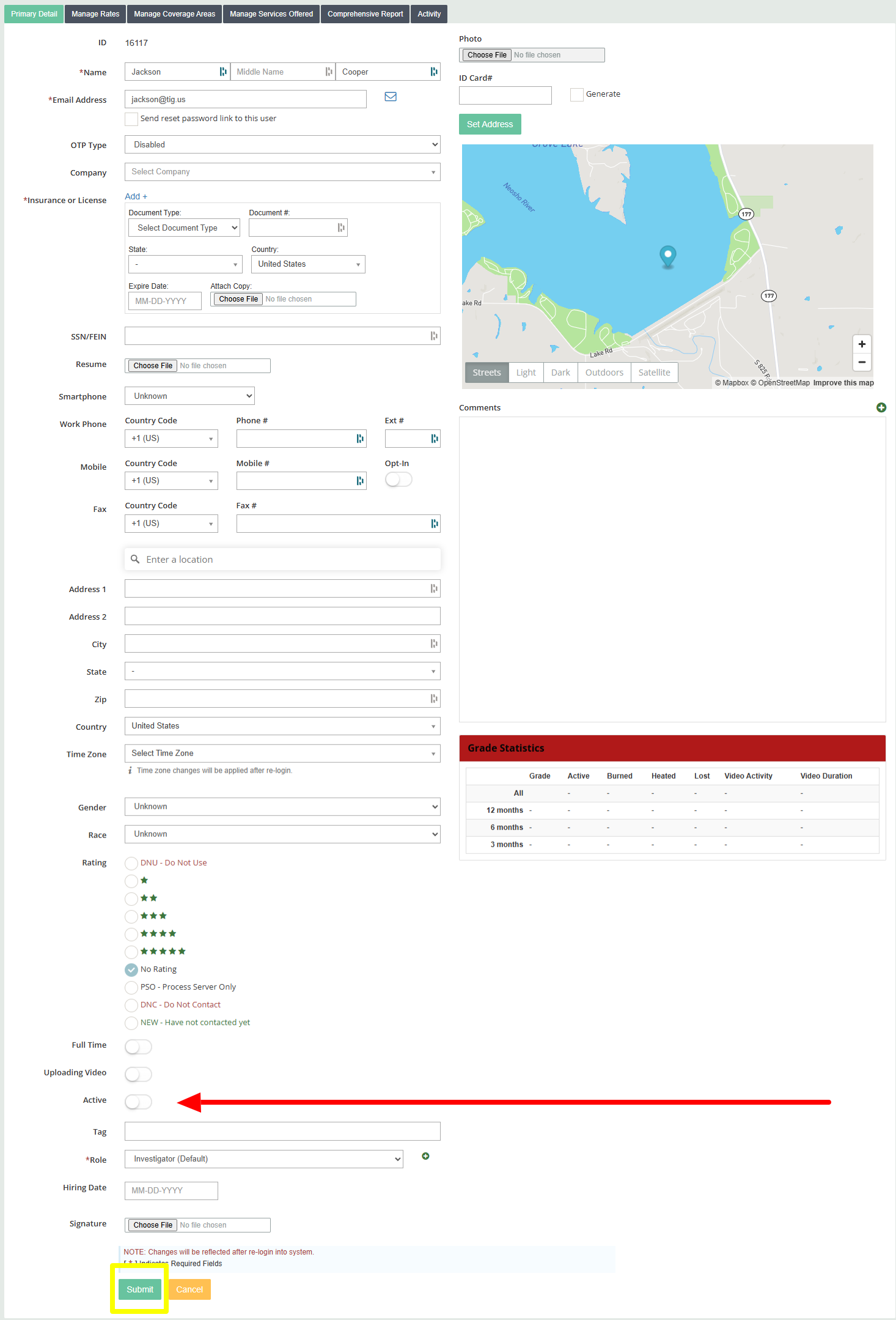 3. Once inside the profile scroll down until you see the word "Active" with a toggle to the right of it. Click the toggle so it shows white. Once the toggle is white you can click submit and this user will no longer have access to your CROSStrax.